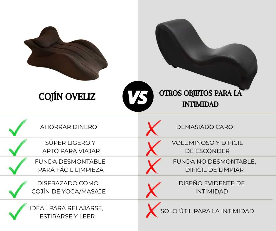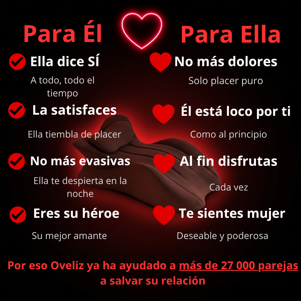 La almohada Oveliz libera los movimientos, equilibra delicadamente los ángulos y hace que cada posición sea fluida y natural. Misionero intenso, cowgirl sin esfuerzo, 69 cómodo, posiciones laterales sin dolor... y eso es solo el comienzo.